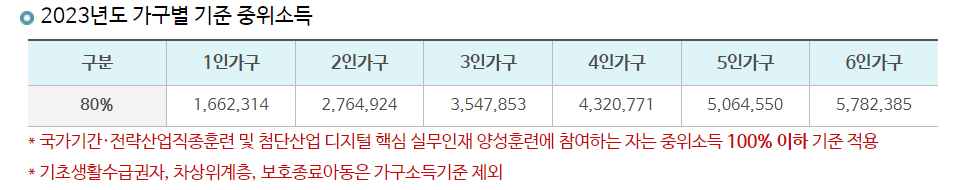 다음은 소득 요건입니다. 전년도 만 20세 이상 가구원 합산 월 소득이 가구별 기준 중위소득 80% 이하이며 “가구원”이란 주민등록표에 등재된 신청인 본인 및 그 배우자, 부모, 배우자의 부모, 자녀를 말합니다. 2023년도 가구별 기준 중위소득은 아래 표와 같습니다.