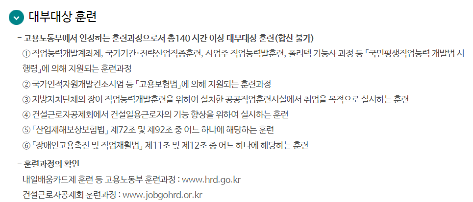 다음으로 대부 요건에 대해 알아보겠습니다. 신청일 현재 대부 대상 훈련에 참여 중이면서, 남은 훈련기간이 15일 이상인 지원 대상자가 이에 해당합니다. 여기서 말하는 대부 대상 훈련이란 고용노동부에서 인정하는 훈련과정으로서 총 140시간 이상의 훈련과정이 이에 속하며 자세한 내용은 아래를 참고하여 주시기 바랍니다.